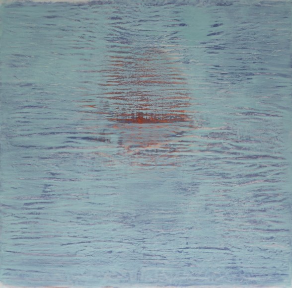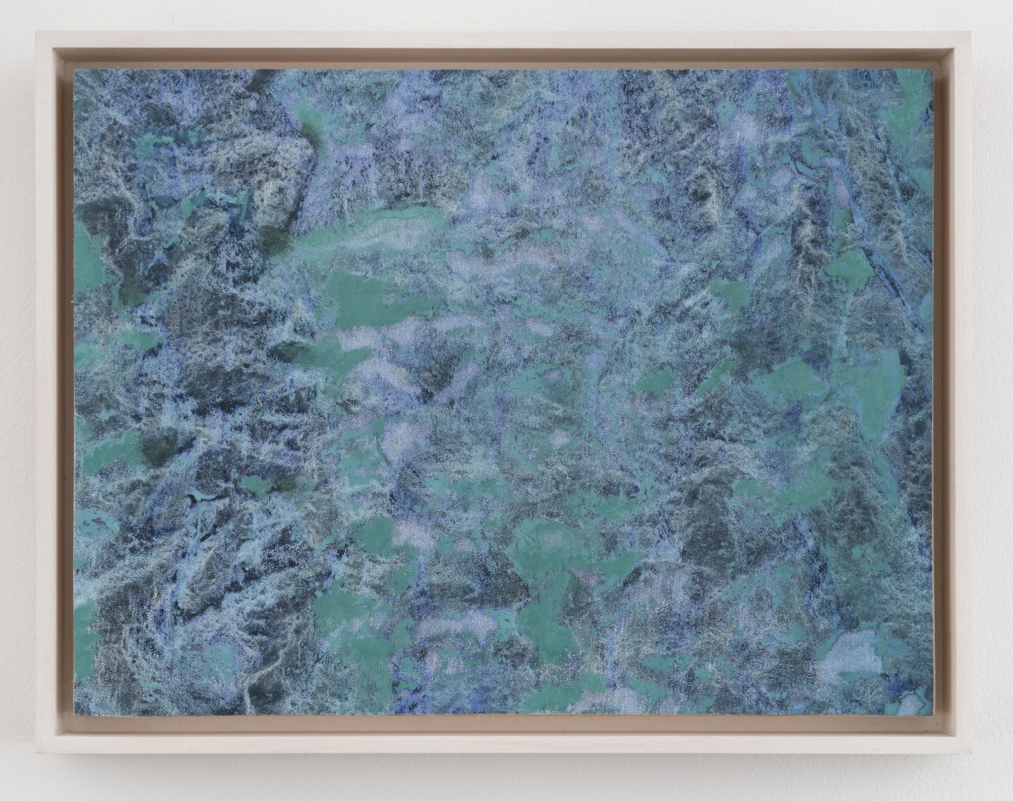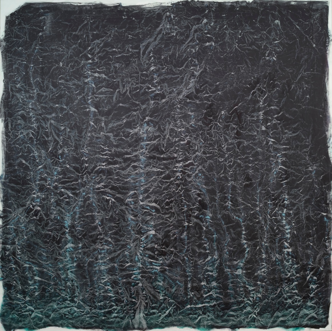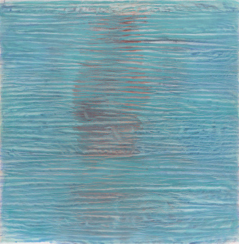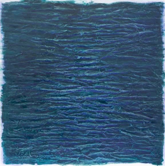 Colombet’s meditative paintings reference the natural world by taking the abstract energy, topography, and sensibility of landscapes as a source of inspiration. Nature always had a calming affect upon Colombet. One that she wanted to communicate by unconventional connections. Her singular style of painting the natural elements begins on un-stretched linen where she marks a canvas with pen or paint creating an imperceptible relief that when in contact with the brush leaves organic traces of pigment; the canvas is manipulated by folding or indenting the surface. A fluid medium of mineral spirit combined with Safflower oil and alkyd are applied before the canvas becomes flat again. The proportion of the medium varies with every pigment and she uses smooth varnishing brushes made of goat hair to avoid brush marks. The effect is the creation of formations, fractals, particles and patterns of chaos. The illusion of this topography in Colombet’s paintings gives the impression of a gestural and impasto surface, but the work is totally flat and smooth.