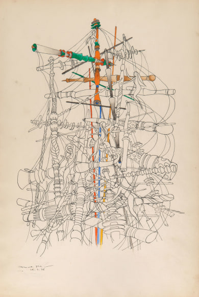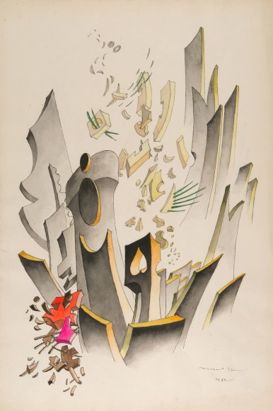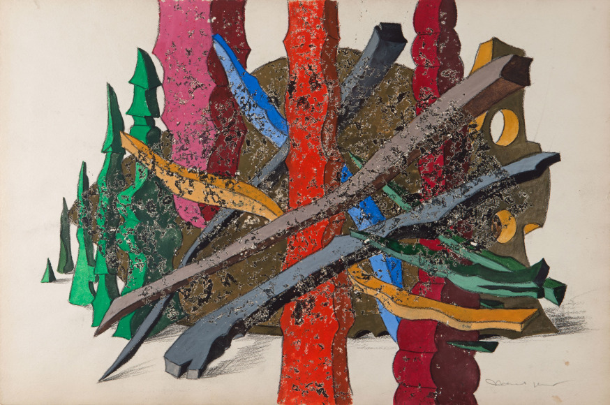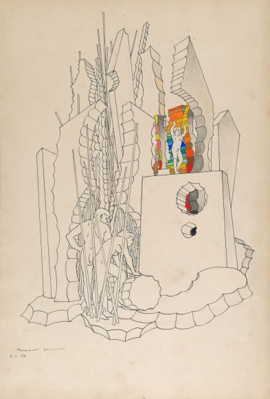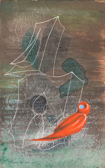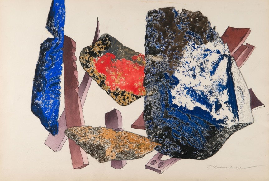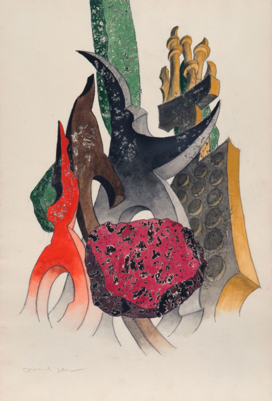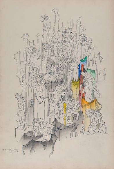 This exhibition is comprised of two separate bodies of work: a series of ink, gouache and watercolor images on paper from the late 1970’s and early 1980’s, and a group of smaller mixed media paintings, incorporating the artist’s self-invented technique described by him as flottage and rendered on masonite, dating from the earlier 1970’s.